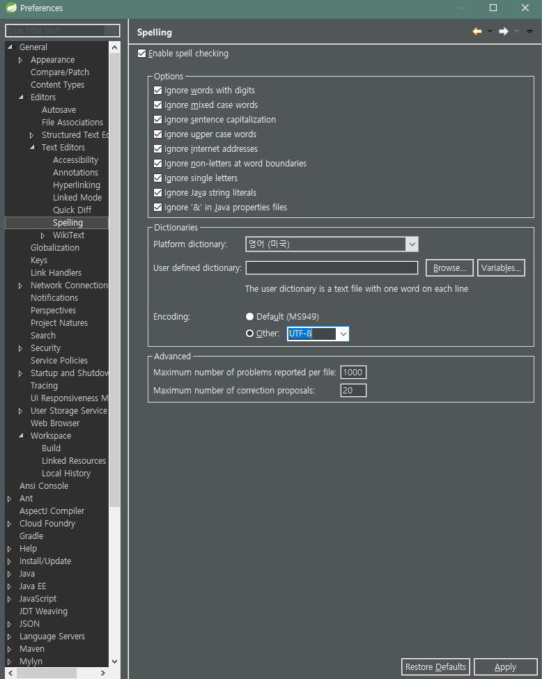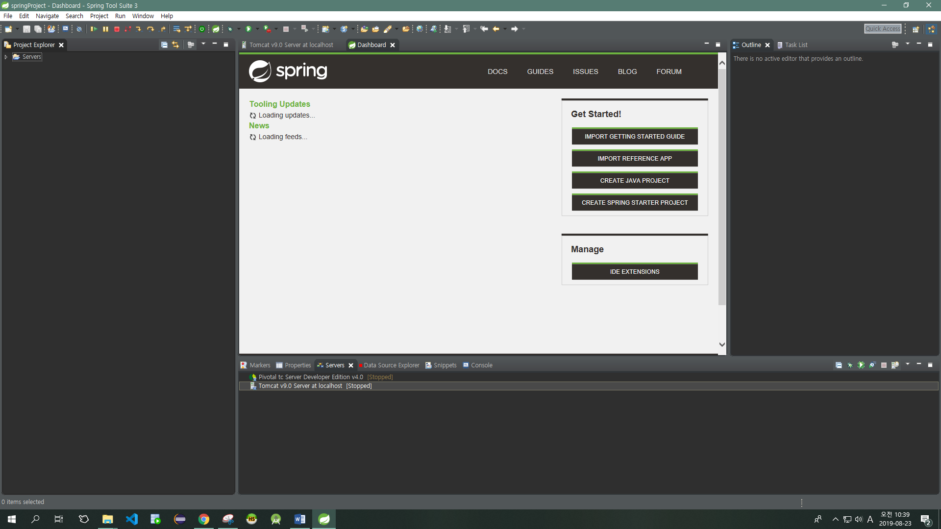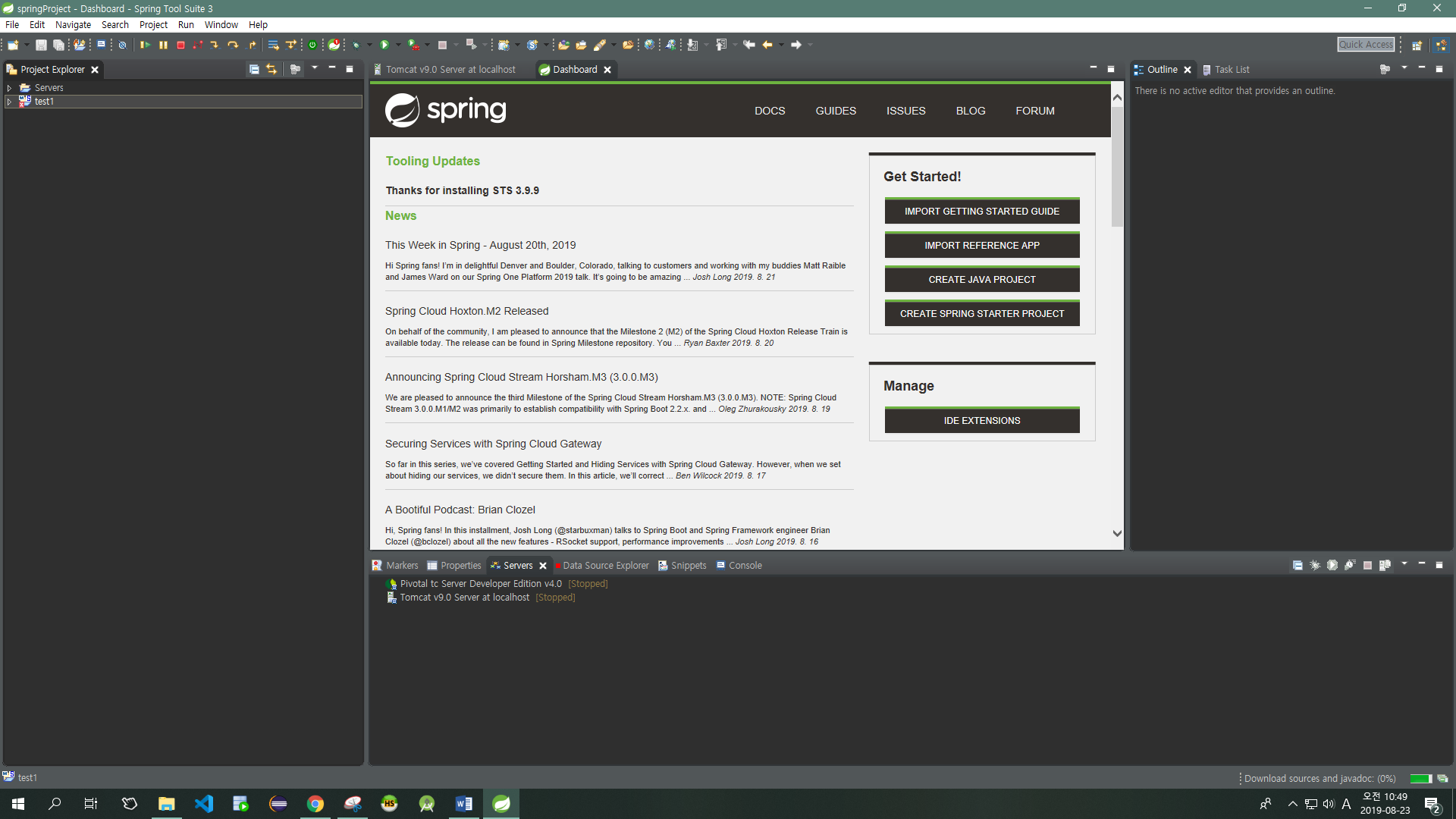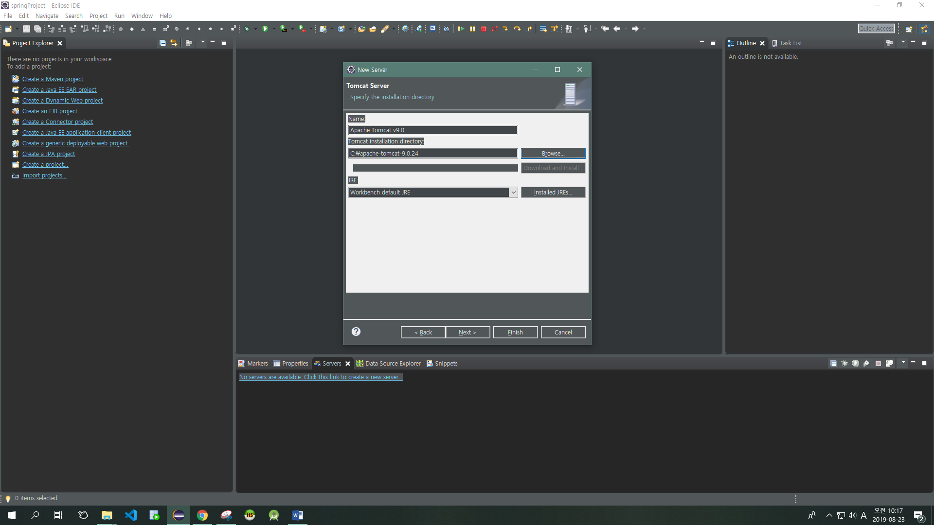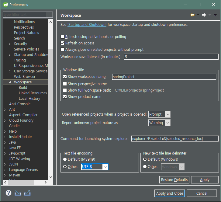 주의 : sts 설치디렉토리 및 workspace는 한글 이름이 들어간 디 렉토리를 사용하지 말 것
