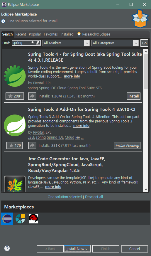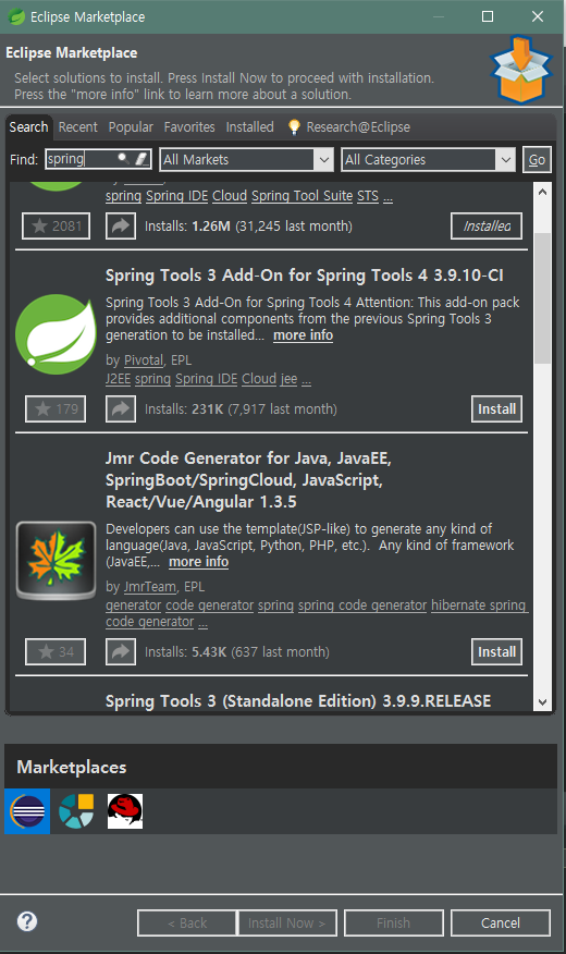 Help > Ecilipse MarketPlace에 들어가서 Spring을 검색하면 Tools와 Add-ON(플러그인)이 있다.