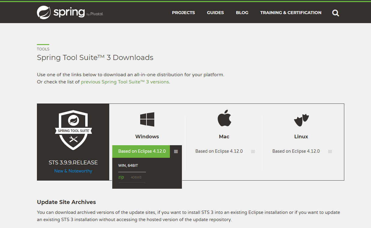 https://spring.io/tools 에서 STS4 다운로드(윈도우 64bit용)