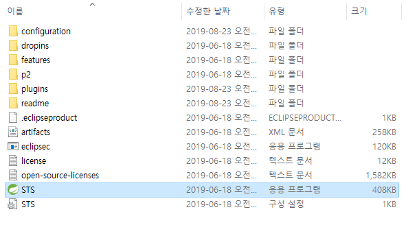 지금받는 파일은 일종의 이클립스라고 보면 된다. 만일 이클립스가 열려있으면 닫은 뒤 sts프로그램을 실행해준다.