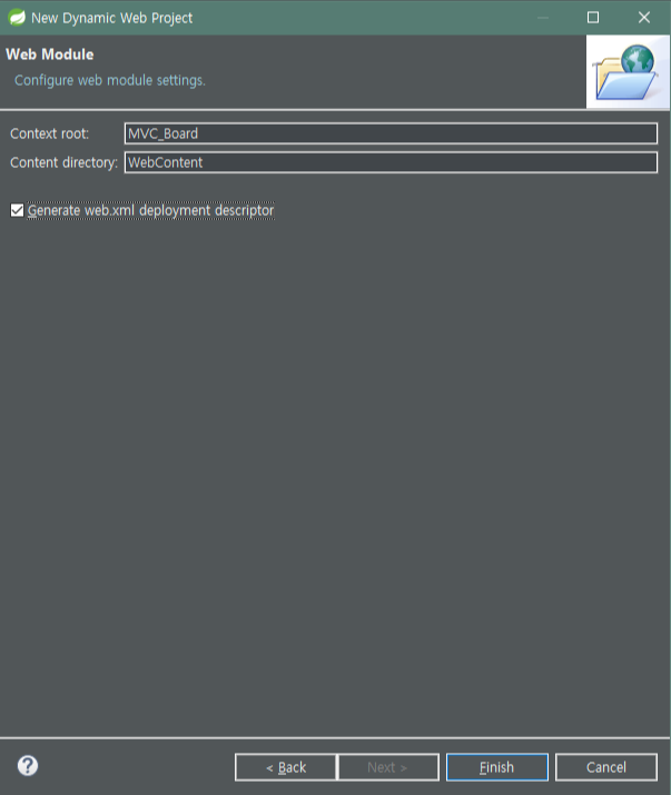 * 만들 때 Generate web.xml deployment desciptor에 체크한 후 Finish한다.