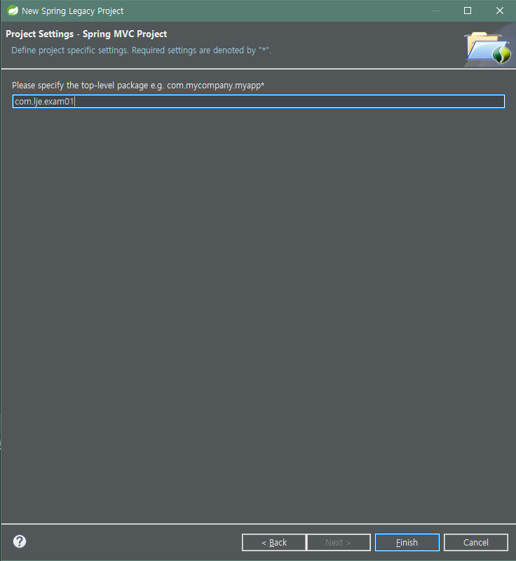 Project Setting>Spring MVC Project화면에서 패키지명을 com.pgm.project01로 지정, finish 선택