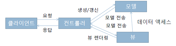컨트롤러 : 서블릿으로 구현, 업무 로직 처리, 모델생성, 모델의 데이터 갱신, 뷰에 모델 전송, 뷰가 변경된 데이터 사용 가능하게 함