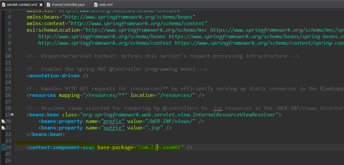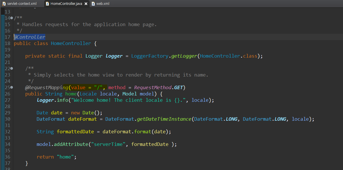 디폴트 패키지에 가서 컨트롤러를 보고, 그 후 RequestMapping 에 보면 / (루트,경로)가 적혀있다.