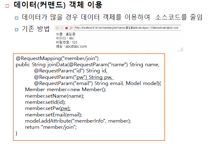 모델 : POJO Java 클래스로 구현, 데이터와 데이터처리에 필요한 메서드 포함, 자신이 관리하는 데이터에 집중