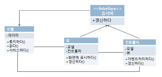 업무 서비스와 도메인 객체를 사용자 인터페이스로부터 분리, 하나 이상의 컨트롤러를 통해서 이들 사이 상호작용을 통제하는 아키텍처 패턴