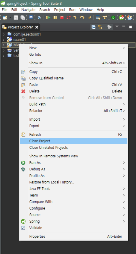 사용하지 않는 프로젝트는 클로즈 시켜서 닫아두어야 엉키는 등의 에러가 없다.