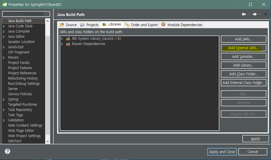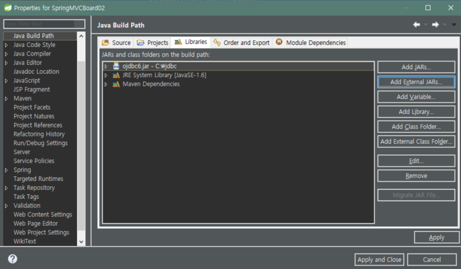 오라클 DB 연결을 위한 준비 : BuildPath, Deployment Assembly에 ojdbc6.jar 추가