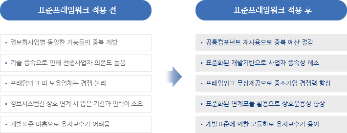 개발프레임워크는 정보시스템 개발을 위해 필요한 기능 및 아키텍처를 미리 만들어 제공함으로써 효율적인 어플리케이션 구축을 지원합니다. “전자정부 표준프레임워크”는 공공사업에 적용되는 개발프레임워크의 표준 정립으로 응용 SW 표준화, 품질 및 재 사용성 향상을 목표로 합니다. 이를 통해“전자정부 서비스의 품질향상” 및 “정보화 투자 효율성 향상”을 달성하고, 대ㆍ중소기업이 동일한 개발기반 위에서 공정 경쟁이 가능하게 됩니다.