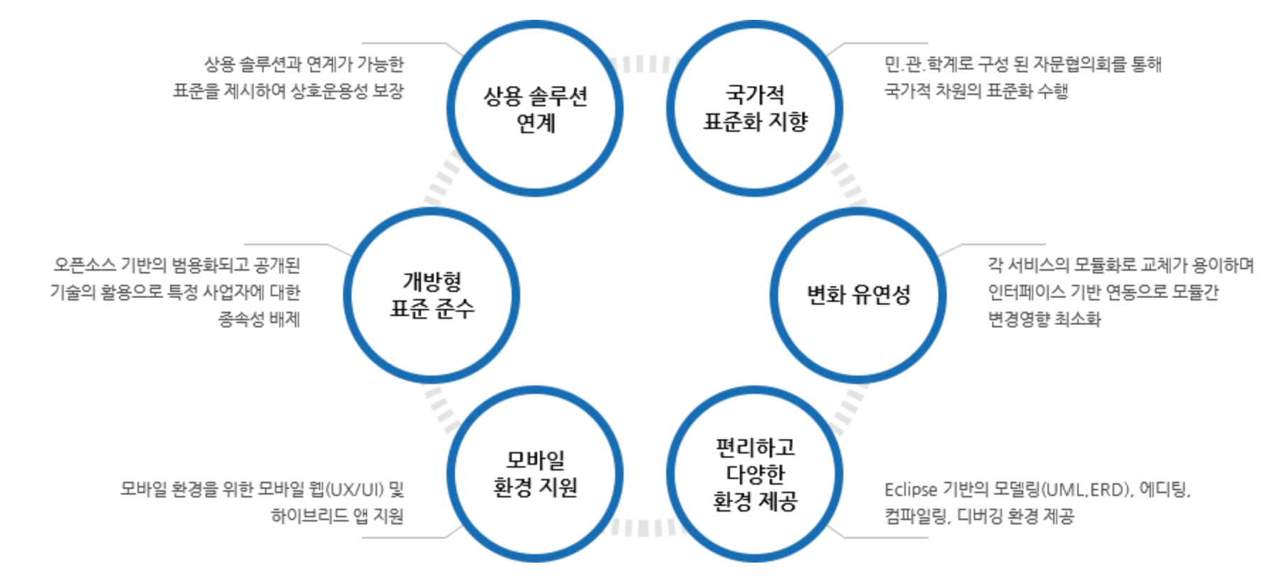 - 템플릿 기반의 정형화된 개발 패턴과 방법을 제공함으로써 설계, 개발 등 시스템 구축 전반에 걸친 표준 제시