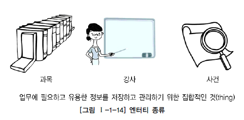 1) 업무가 관여하는 어떤 것(Things) 2) 어떤 것이 가지는 성격(Attributes) 3) 업무가 관여하는 어떤 것 간의 관계(Relationships)
