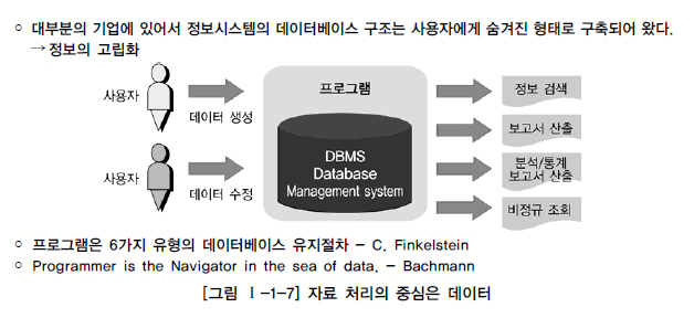 우리가 구축하려는 시스템 대부분을 데이터에 기반한, 데이터가 중심에 있는 정보시스템을 구축하기 때문에 정보시스템의 핵심에 있는 데이터베이스 설계를 잘못했을 때 미치는 영향력은 모든 프로그램, 시간에 따라 입력되는 모든 데이터, 그리고 그 데이터베이스에 발생되는 모든 트랜잭션에 영향을 미칠 수 밖에 없게 된다. Bachmann은 ‘프로그래머는 데이터집합의 탐색자이다’라고 하였다. 그만큼 데이터에 대한 중요성을 높게 평가하는 것이다.