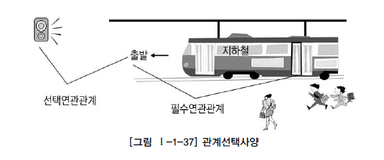 또 지하철 안내방송시스템의 예를 들어보자. 지하철의 출발을 알리는 안내방송은 지하철의 출발과 상관없이 방송해도 아무런 문제가 발생하지 않는다. 물론 정해진 시간에 방송을 하면 승객에게 정보로서 유익하겠지만 꼭 그렇게 할 필요는 없다. 그래서 가끔씩 시스템의 녹음된 여성의 목소리가 아닌 시끄러운 남자 기사가 방송을 하는 경우가 있다. 안내방송시스템이 고장이 나도 지하철운행에는 별로 영향을 주지 않는다. 방송시점도 조금씩 다르게 나타나도 지하철이 출발하는 것과는 밀접하게 연관되지 않는다. 이와 같이 지하철의 출발과 지하철방송과는 정보로서 관련은 있지만 서로가 필수적인(Mandatory) 관계는 아닌 선택적인 관계(Optional)가 되는 것이다.