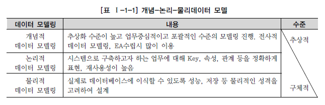 처음 현실세계에서 추상화 수준이 높은 상위 수준을 형상화하기 위해 개념적 데이터 모델링을 전개한다. 개념적 데이터 모델은 추상화 수준이 높고 업무중심적이고 포괄적인 수준의 모델링을 진행한다. 참고로 EA기반의 전사적인 데이터 모델링을 전개할 때는 더 상위수준인 개괄적인 데이터 모델링을 먼저 수행하고 이후에 업무영역에 따른 개념적 데이터 모델링을 전개한다. 엔터티(Entity)중심의 상위 수준의 데이터 모델이 완성되면 업무의 구체적인 모습과 흐름에 따른 구체화된 업무중심의 데이터 모델을 만들어 내는데 이것을 논리적인 데이터 모델링이라고 한다. 논리적인 데이터 모델링 이후 데이터베이스의 저장구조에 따른 테이블스페이스 등을 고려한 방식을 물리적인 데이터 모델링이라고 한다. 이것을 요약하여 정리하면 [표 Ⅰ-1-1]과 같다.