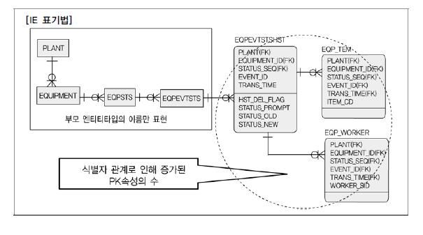 [그림 Ⅰ-1-50]의 데이터 모델은 원시 엔터티이었던 PLANT의 경우 단지 한 개의 속성만이 PK속성이었으나 EQPEVTSTSHST 엔터티의 경우 부모로부터 모두 식별자관계 연결로 인해 PK속성의 개수가 무려 5개나 설정될 수 밖에 없게 된 사례이다.