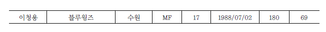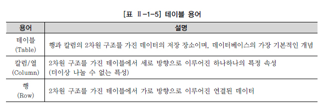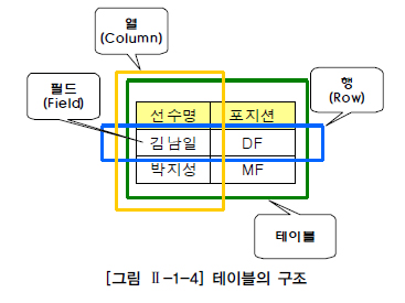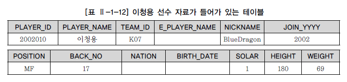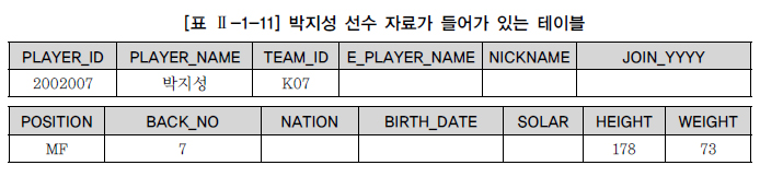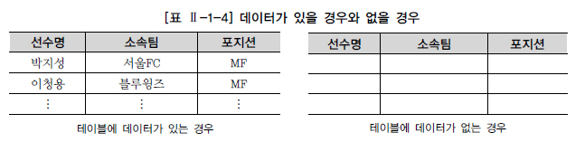 [표 Ⅱ-1-3]의 내용을 보면 선수, 팀, 팀연고지, 포지션, 등번호, 생년월일, 키, 몸무게가 각각의 칼럼이 되며, 해당 테이블은 반드시 하나 이상의 칼럼을 가져야 한다. 예를 들어 이청용 선수에 대한 정보는 아래와 같이 8개의 칼럼을 가지는 하나의 행으로 데이터화 되어 테이블에 저장된 것이다