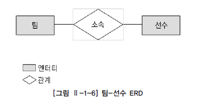 [그림 Ⅱ-1-6]처럼 팀과 선수 간에는 “소속”이라는 관계가 맺어져 있다. 테이블 간 서로의 상관 관계를 그림으로 도식화한 것을 E-R 다이어그램이라고 하며, 간략히 ERD라고 한다. ERD의 구성 요소는 엔터티(Entity), 관계(Relationship), 속성(Attribute) 3가지이며 현실 세계의 데이터는 이 3가지 구성 요소로 모두 표현이 가능하다.