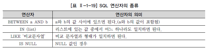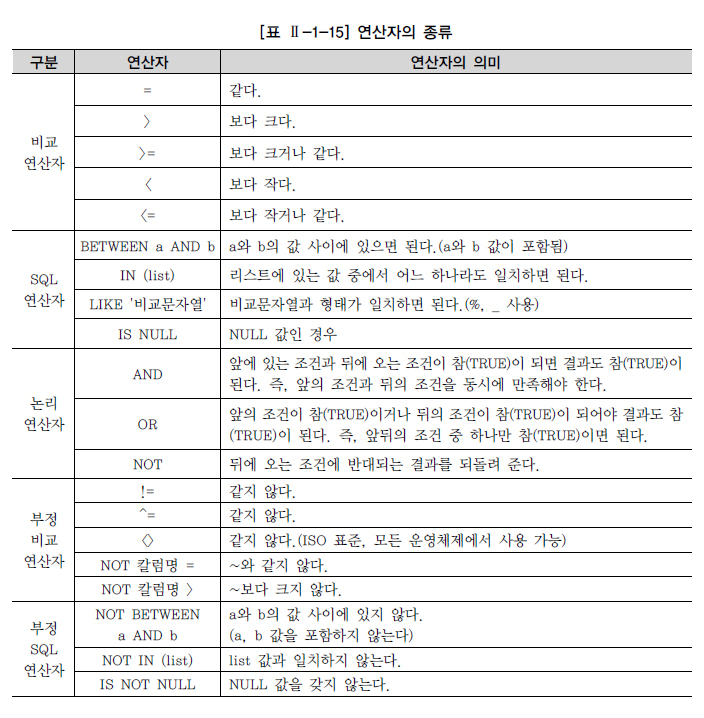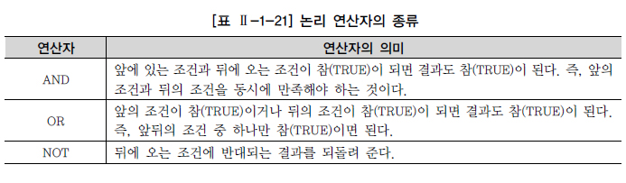 논리 연산자는 비교 연산자나 SQL 비교 연산자들로 이루어진 여러 개의 조건들을 논리적으로 연결시키기 위해서 사용되는 연산자라고 생각하면 된다. [표 Ⅱ-1-21]울 보고 실제로 적용되는 예를 통해 사용방법을 이해한다.