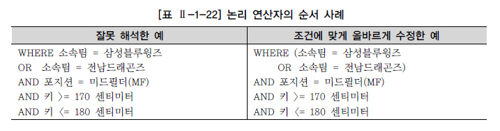 실행 결과의 내용을 보면 포지션이 미드필더(MF: MidFielder)가 아닌 선수들의 명단이 출력되었다. 원하는 데이터는 삼성블루윙즈이거나 전남드래곤즈 중 포지션이 미드필더(MF: Midfielder)인 선수들에 대한 자료만 요청했는데 포지션이 DF나 FW인 선수가 같이 출력된 것이다. [예제]에서 “소속팀 코드가 삼성블루윙즈(K02) 이거나 전남드래곤즈(K07)”라는 조건을 만족하고 “포지션이 미드필더(MF)”인 조건을 동시에 만족해야 하는데, 위의 SQL 문장에서는 괄호가 누락됨으로서 OR 논리 연산자보다 AND 논리 연산자를 먼저 실행하기 때문에 잘못된 결과를 나타낸 것이다. 논리 연산자들이 여러 개가 같이 사용되었을 때의 처리 우선순위는 ( ), NOT, AND, OR의 순서대로 처리된다.