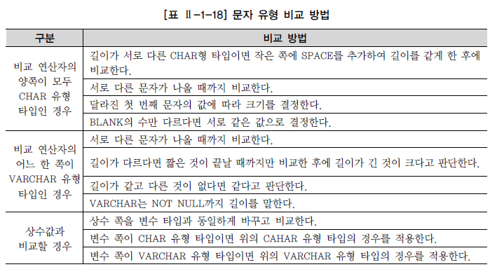 추가적으로 문자 유형간의 비교 조건이 발생하는 경우는 [표 Ⅱ-1-18]과 같이 처리한다.