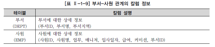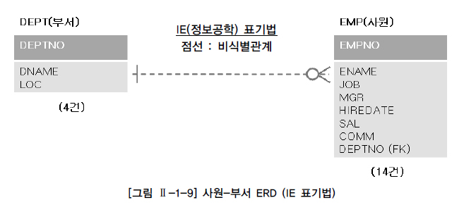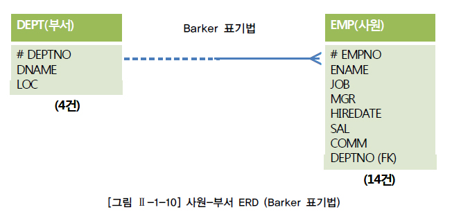 [그림 Ⅱ-1-9]와 [그림 Ⅱ-1-10]은 앞으로 사용하게 될 부서-사원 테이블 간의 관계를 IE 표기법과 Barker 표기법으로 표현한 ERD이다.