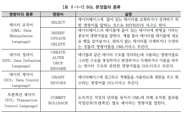 SQL 문장과 관련된 용어 중에서 먼저 테이블에 대한 내용은 건드리지 않고 단순히 조회를 하는 SELECT 문장이 있다. 그리고 테이블에 들어 있는 데이터에 변경을 가하는 UPDATE, DELETE, INSERT 문장은 테이블에 들어 있는 데이터들을 조작하는 종류의 SQL 문장들이다. 그 외, 테이블을 생성하고 수정하고 변경하고 삭제하는 테이블 관련 SQL 문장이 있고, 추가로 데이터에 대한 권한을 제어하는 SQL 문장도 있다.