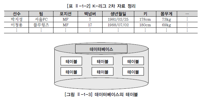 테이블은 어느 특정한 주제와 목적으로 만들어지는 일종의 집합이다. [표 Ⅱ-1-2]처럼 K-리그 선수들의 정보들을 하나의 표에서 정리할 수 있다면, 이 표만 있다면 내가 좋아하는 선수들의 상세한 정보들을 볼 수 있고, 선수들의 정보를 상호간에 비교해 볼 수도 있다. 새로운 선수를 입력하려고 할 때 새로운 테이블을 생성할 필요 없이 데이터만 추가함으로서 선수들의 정보를 모두 관리할 수 있다.