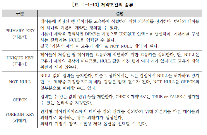 제약조건(CONSTRAINT)이란 사용자가 원하는 조건의 데이터만 유지하기 위한 즉, 데이터의 무결성을 유지하기 위한 데이터베이스의 보편적인 방법으로 테이블의 특정 칼럼에 설정하는 제약이다. 테이블을 생성할 때 제약조건을 반드시 기술할 필요는 없지만, 이후에 ALTER TABLE을 이용해서 추가, 수정하는 경우 데이터가 이미 입력된 경우라면 처리 과정이 쉽지 않으므로 초기 테이블 생성 시점부터 적합한 제약 조건에 대한 충분한 검토가 있어야 한다.