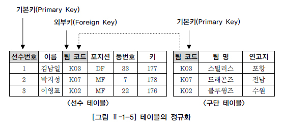 선수와 관련된 데이터를 저장할 때 모든 데이터를 하나의 테이블로 저장하지 않는다. [그림 Ⅱ-1-5]를 보면 선수와 관련된 데이터를 선수 테이블과 구단 테이블이라는 복수의 테이블로 분할하여 저장하고 있다.