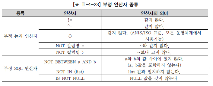 비교 연산자, SQL 비교 연산자에 대한 부정 표현을 부정 논리 연산자, 부정 SQL 연산자로 구분할 수 있다.