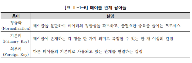 각 행을 한 가지 의미로 특정할 수 있는 한 개 이상의 칼럼을 기본키(Primary Key)라고 하며, 여기서는 <선수> 테이블의 ‘선수번호’와 <구단> 테이블의 ‘구단코드’가 기본키가 된다. 또, <선수> 테이블의 ‘구단코드’와 같이 다른 테이블의 기본 키로 사용되면서 테이블과의 관계를 연결하는 역할을 하는 칼럼을 외부키(Foreign Key)라고 한다.