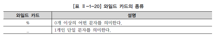 LIKE의 사전적 의미는 ‘~와 같다’이다. 따라서 위와 같은 경우라면 비교 연산자인 ‘=’을 사용해서 작성해도 같은 결과를 얻을 수 있을 것이다. 그러나 만약 “장”씨 성을 가진 선수들을 조회할 경우는 어떻게 할까? 이런 문제를 해결하기 위해서 LIKE 연산자에서는 와일드카드(WildCard)를 사용할 수 있다. 와일드카드(WildCard)란 한 개 혹은 0개 이상의 문자를 대신해서 사용하기 위한 특수 문자를 의미하며, 이를 조합하여 사용하는 것도 가능하므로 SQL 문장에서 사용하는 스트링(STRING) 값으로 용이하게 사용할 수 있다.