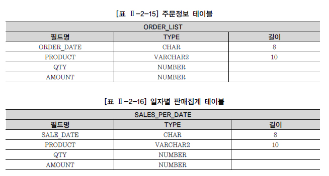 [예제] Oracle CREATE TABLE ORDER_LIST ( ORDER_DATE CHAR(8) NOT NULL, PRODUCT VARCHAR2(10) NOT NULL, QTY NUMBER NOT NULL, AMOUNT NUMBER NOT NULL); CREATE TABLE SALES_PER_DATE ( SALE_DATE CHAR(8) NOT NULL, PRODUCT VARCHAR2(10) NOT NULL, QTY NUMBER NOT NULL, AMOUNT NUMBER NOT NULL);