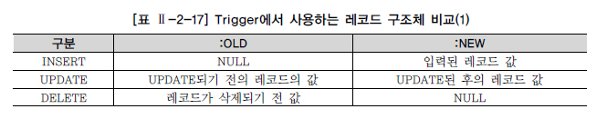 ① Trigger를 선언한다.CREATE OR REPLACE Trigger SUMMARY_SALES : Trigger 선언문AFTER INSERT : 레코드가 입력이 된 후 Trigger 발생 ON ORDER_LIST : ORDER_LIST 테이블에 Trigger 설정FOR EACH ROW : 각 ROW마다 Trigger 적용 ② o_date(주문일자), o_prod(주문상품) 값을 저장할 변수를 선언하고, 신규로 입력된 데이터를 저장한다. : NEW는 신규로 입력된 레코드의 정보를 가지고 있는 구조체 : OLD는 수정, 삭제되기 전의 레코드를 가지고 있는 구조체 [표 Ⅱ-2-17] 참조 ③ 먼저 입력된 주문 내역의 주문 일자와 주문 상품을 기준으로 SALES_PER_DATE 테이블에 업데이트한다. ④처리 결과가 SQL%NOTFOUND이면 해당 주문 일자의 주문 상품 실적이 존재하지 않으며, SALES_ PER_DATE 테이블에 새로운 집계 데이터를 입력한다.