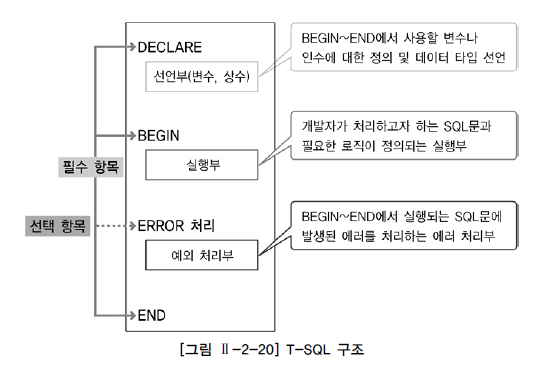 - DECLARE : BEGIN ~ END 절에서 사용될 변수와 인수에 대한 정의 및 데이터 타입을 선언하는 선언부이다. - BEGIN ~ END : 개발자가 처리하고자 하는 SQL문과 여러 가지 비교문, 제어문을 이용하여 필요한 로직을 처리하는 실행부이다. T-SQL에서는 BEGIN, END 문을 반드시 사용해야하는 것은 아니지만 블록 단위로 처리하고자 할 때는 반드시 작성해야 한다. - ERROR 처리 : BEGIN ~ END 절에서 실행되는 SQL문이 실행될 때 에러가 발생하면 그 에러를 어떻게 처리할 것이지를 정의하는 예외 처리부이다.