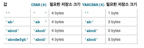 - 다음 표는 문자열을 CHAR(4)와 VARCHAR(4) 열에 보관할 때 CHAR와 VARCHAR형의 차이점을 보여준다.