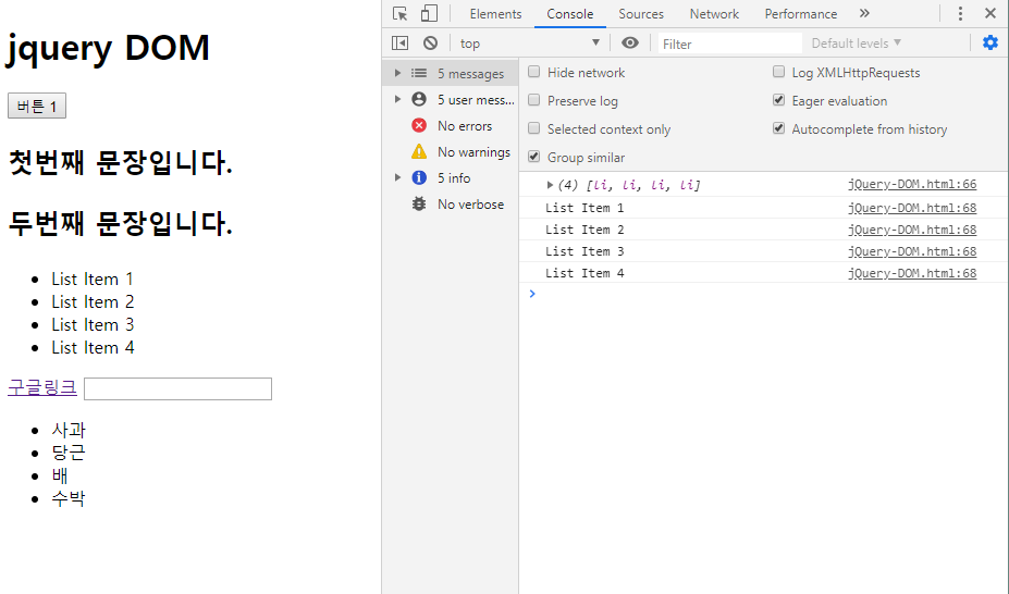 //$('ul').empty(); // 콘솔에서 보면 ul태그는 사라지지 않고 ul 안의 텍스트만 사라짐