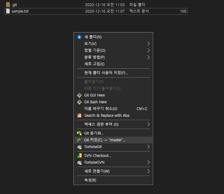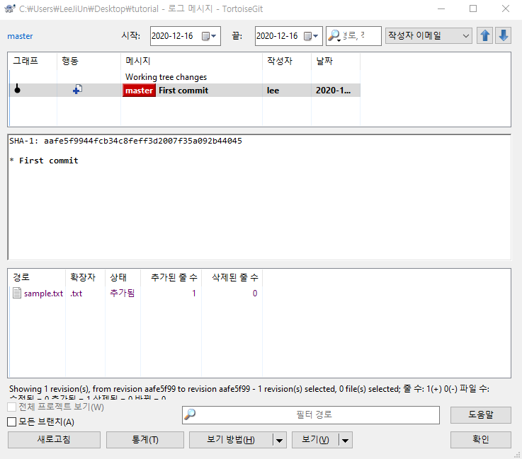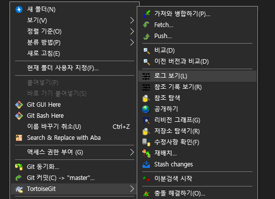 폴더 내부를 우클릭하여 TortoiseGit, 로그 표시를 클릭해보면 커밋 이력에 방금 커밋한 내용이 추가되어 있습니다.