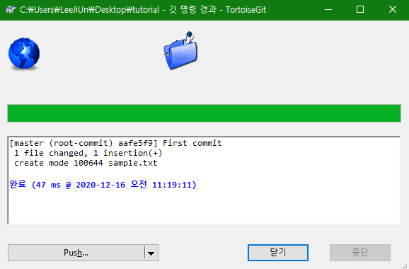 테스트용 텍스트를 삽입한 메모장을 생성 후, 저장소 폴더에 저장합니다. tutorial 폴더 안을 우클릭, Git 커밋을 클릭합니다. 팝업창에서 파일을 선택한 후 커밋을 누릅니다. 커밋이 완료되면 닫기 버튼을 누릅니다.