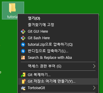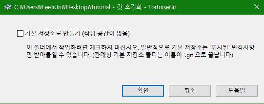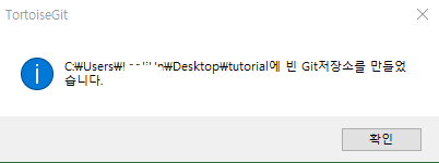 초기설정이 끝났으면, 이어서 특정 폴더를 로컬 저장소로 등록합니다. tutorial이라는 이름의 폴더로 하겠습니다. 폴더에어 우클릭하여 Git 저장소 여기에 만들기(Git Create repository here...)를 선택합니다. 팝업창이 뜨면 확인, OK를 누릅니다. 항목에 체크하면 단순히 Push된 변경내역만 보입니다. PC와 웹에서 동일한 모든 작업을 하려면 체크하지 않아야 합니다.