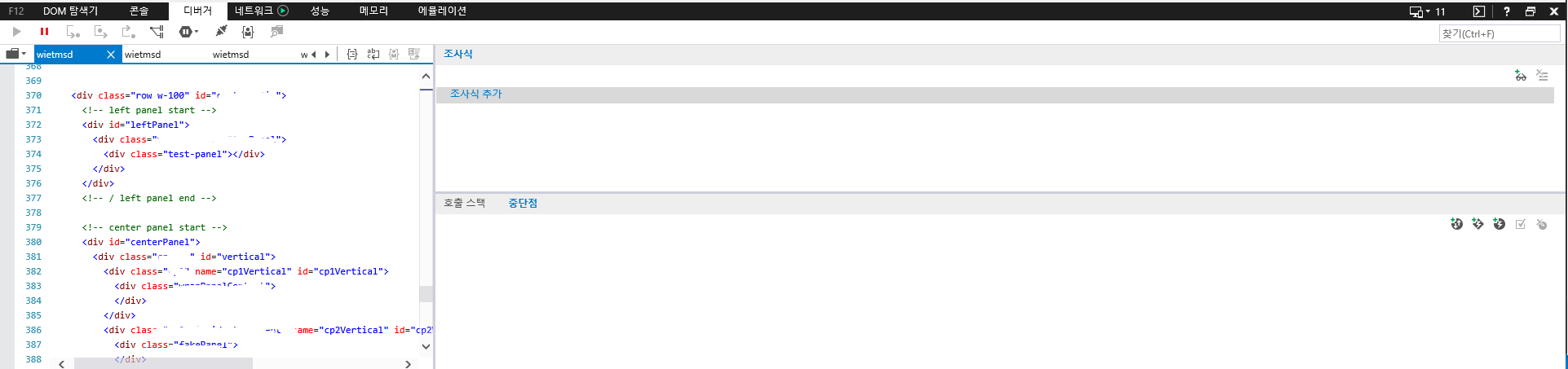 개발 중인 프로젝트가 익스플로러로 개발이 필요하여 ie 브라우저로 작업중이었습니다. 그런데 가상머신 내에서 익스플로러로 디버깅을 하다가 언젠가부터 디버거 모드에 코드가 사라졌음. 급한대로 다른 브라우저로 디버깅을 하며 개발 중이었는데 다음 날 해답을 얻었습니다...