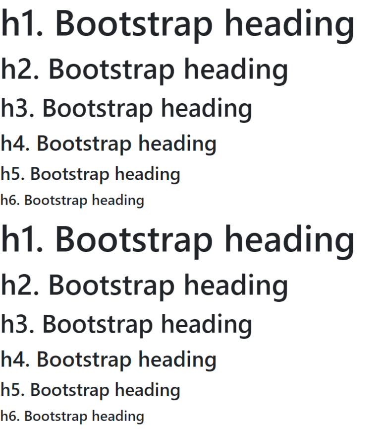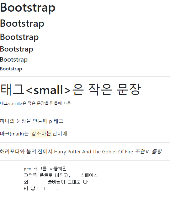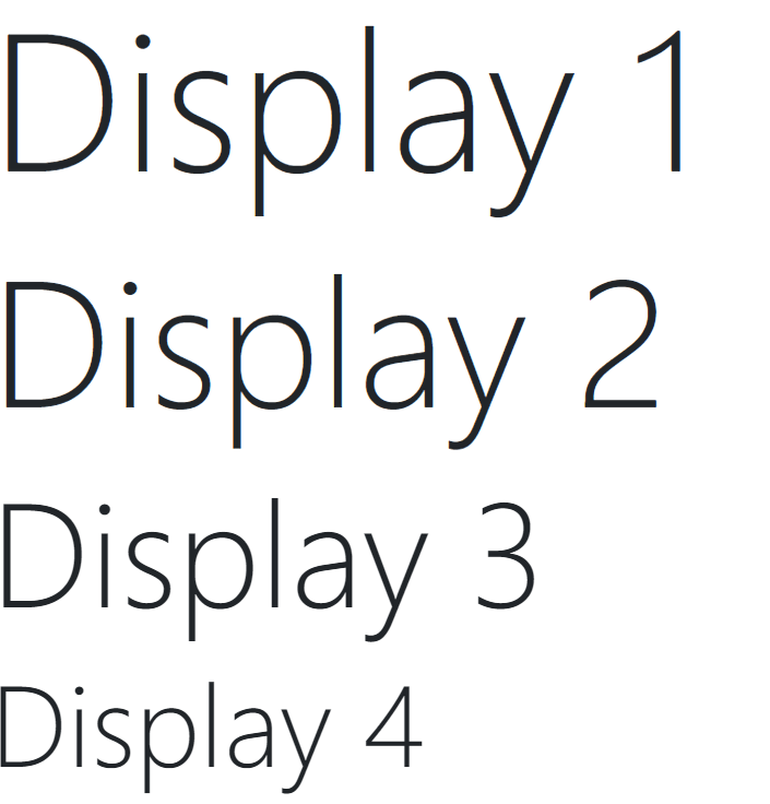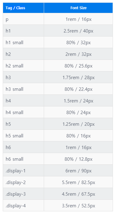 html태그와 조금 형식과 디자인이 다르다. 글자 서식 (Typohography)의 기본세팅은 폰트 사이즈 (16px), line-height 1.5em, font-weight 400이다. ? em : 현재 폰트의 배수 ? rem: 기본폰트(16px) 의 배수이다. display는 애플 시스템 폰트가 기본이다. 각 상세한 부트스트랩의 폰트 사이즈는 아래 표를 참고.