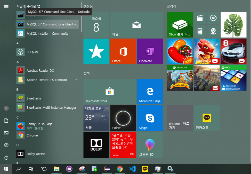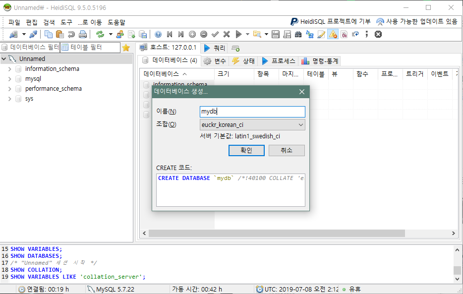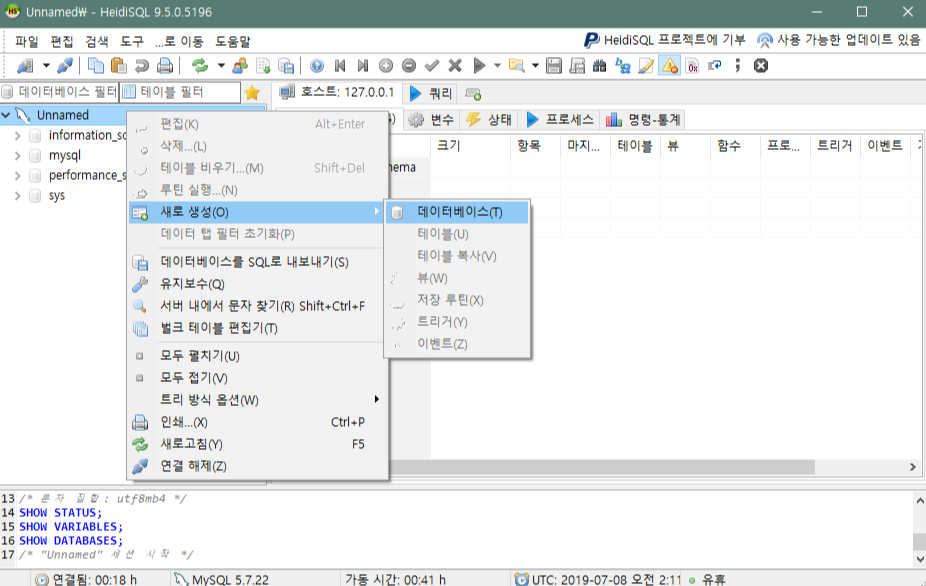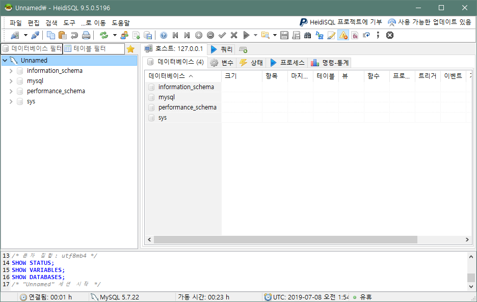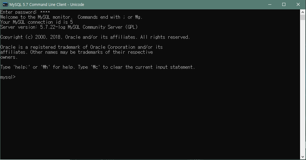시작 > MySQL 5.7 Command Line Client - Unicode 에 들어간다