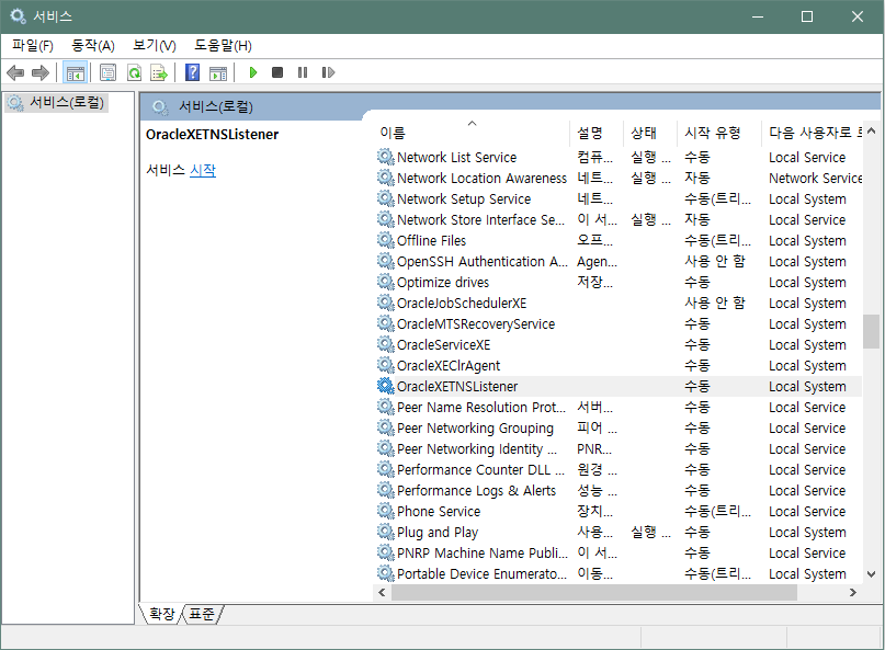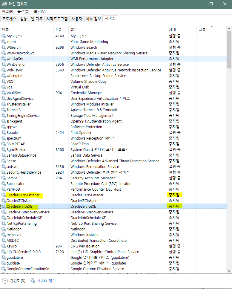 작업관리자 > Listener , ServiceXE를 변경하자. 다시시작 때에도 자동 시작이 안되려면 속성에 들어가서 설정해주면 된다.