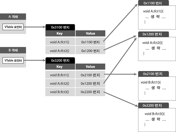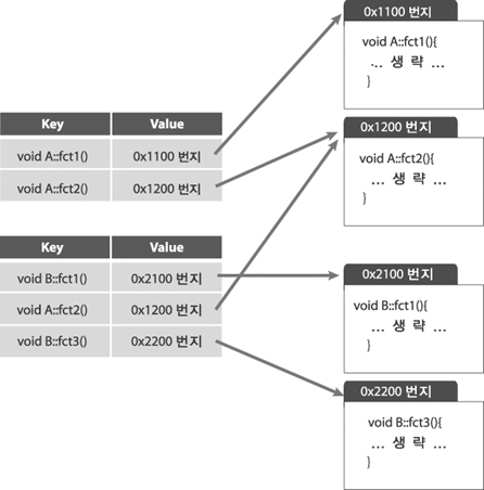 // 그 클래스의 멤버함수 정보를 지니는 a 클래스 객체의 virtual 테이블이 생성된다.