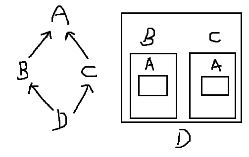 B와 C클래스가 A클래스를 virtual로 상속을 하면 D가 상속하는 A클래스는 한번만 상속되는 규칙