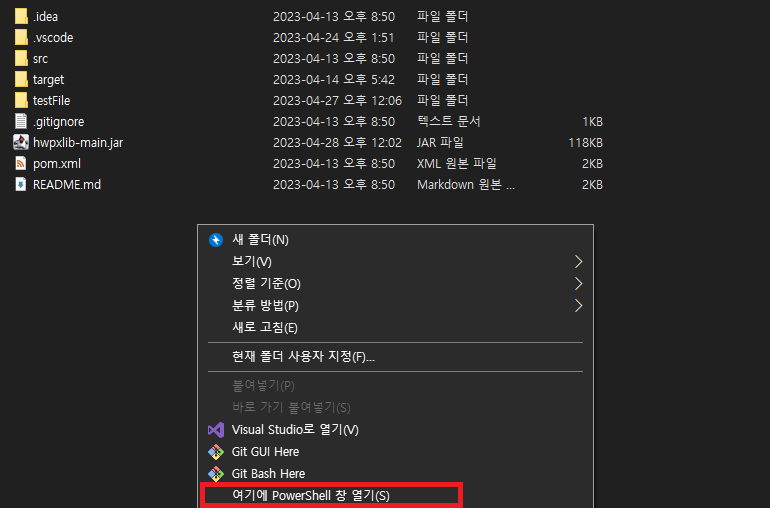 5. 만들어진 폴더에서 Shift + 우클릭 > Powershell 창 열기 클릭