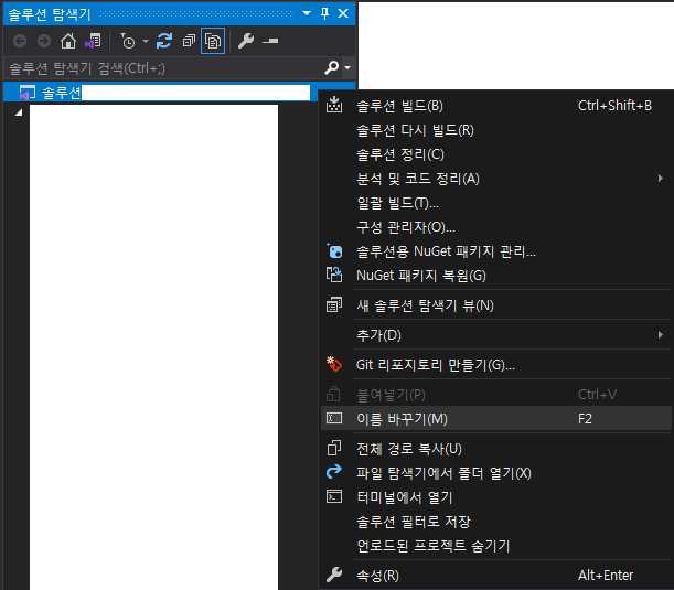 1. 솔루션 탐색기 - 프로젝트 우클릭 - 이름 바꾸기 - 이름 변경