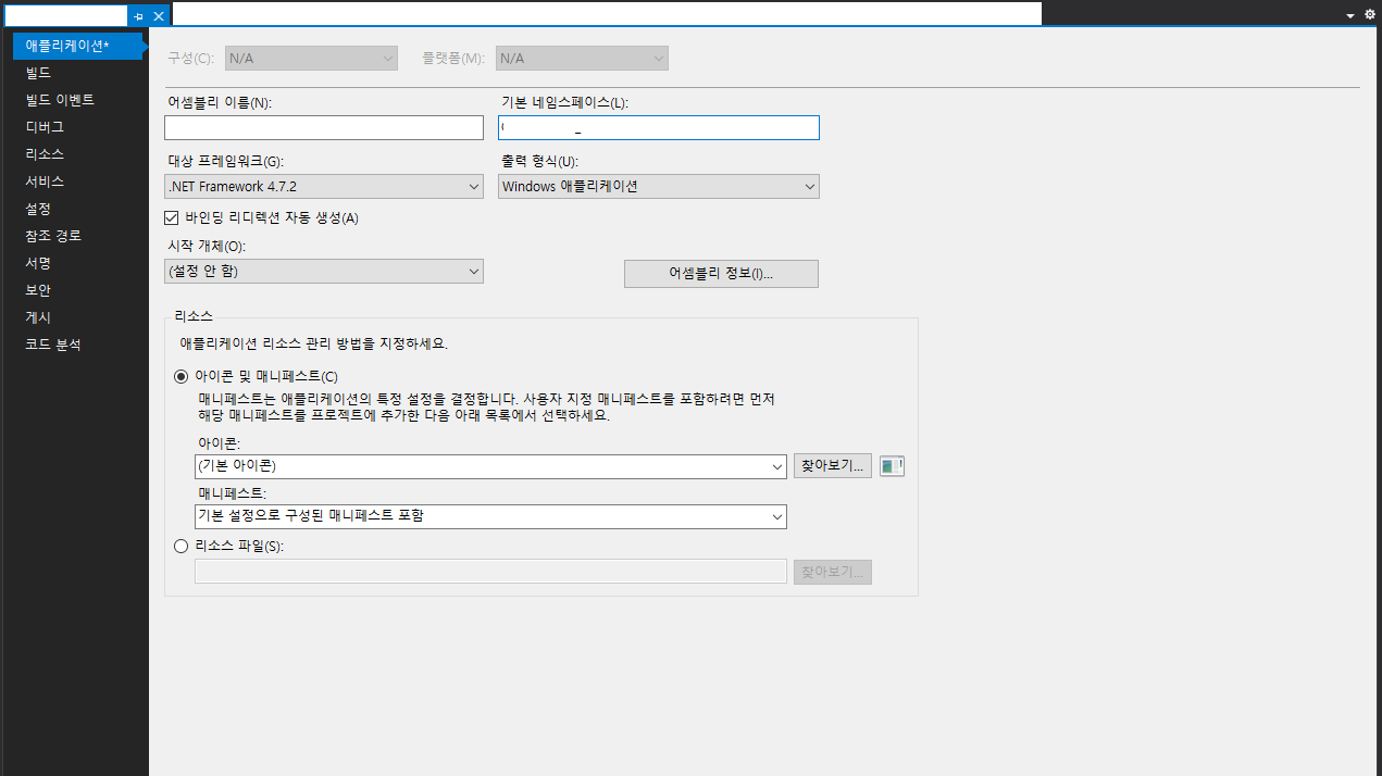 2. 솔루션 탐색기 - 프로젝트 우클릭 - 속성 - 애플리케이션 - 어셈블리 이름, 네임스페이스 변경