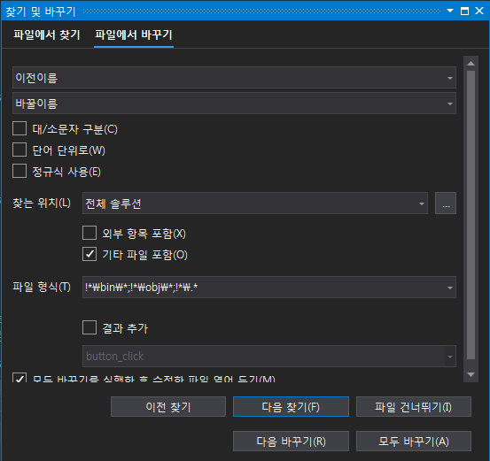 3. Ctrl + Shift + H (찾기 및 바꾸기 - 파일에서 바꾸기) : 바꿀 이름으로 바꿔주고 '모두 바꾸기' 버튼 클릭